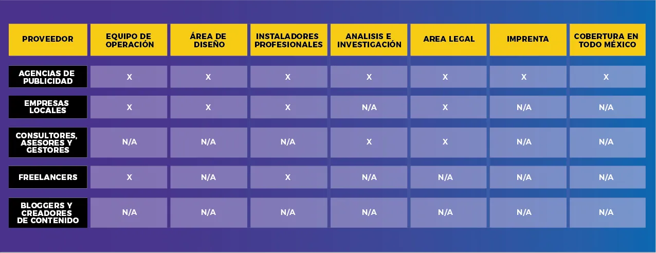 Cuadro comparativo proveedores publicitarios en México.