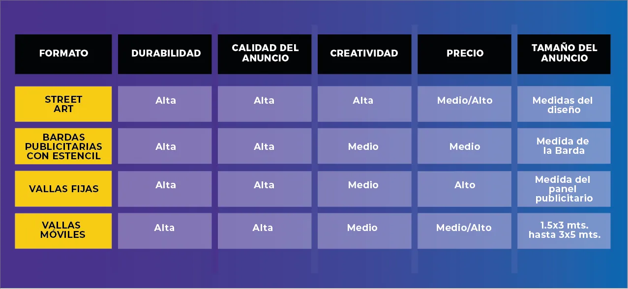 - Cuadro comparativo de los anuncios más usados para los muros publicitarios.